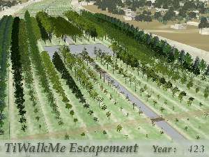 The TiWalkMe Forest, its grounds, it buildings and ever changing landscape form a clock, together called the TiWalkMe Escapement. The Escapement is an immense timepiece, born as a sinuous, unplanted ribbon of land, carved into twenty long avenues separated by raised soil beds. In “Year 1” twenty seedlings, from a variety of species native to the region, are planted in a row. In Year 2, a second row of twenty seedlings are planted to join their older, taller siblings. And so on. Each year another row is added, and each year a small forest of trees, from large to small, makes their stately procession down the Escapement. A college student will have seen 20 trees planted in their lifetime- about the length of a football field. But turning towards the future, viewed down the length of the park, five miles of planting beds remain to be filled over the next 1000 years. The mind may not grasp deep time, but the feet will send a powerful image to the brain during the two hours it takes to walk the length of a millennia.